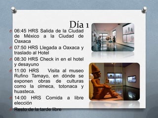 El documento presenta un itinerario de 5 días en Oaxaca que incluye visitas a museos como el Rufino Tamayo, el Museo Textil de Oaxaca y el Museo de Arte Contemporáneo, así como al Zócalo, el Ex Convento de San Juan Bautista y la Mezcaloteca. También incluye paseos por el tradicional Viernes del Llano y regreso a la Ciudad de México el quinto día. El costo total es de $8,350 MXN e incluye transporte aéreo y terrestre, así como
