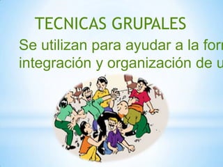 Las técnicas grupales se utilizan para ayudar a la formación e integración de un grupo. Algunas técnicas incluyen simposios, congresos y mesas redondas para participación de expertos, así como diligencias para participación del grupo. Es importante que el docente aplique principios como ser promotor del saber, facilitador del aprendizaje y líder democrático. Las técnicas grupales deben planearse y evaluarse adecuadamente para lograr los objetivos del grupo.