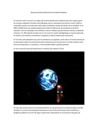 El documento resume la visita de un estudiante al Museo de Historia Natural de la Ciudad de México. El estudiante aprendió sobre el origen del universo a partir del Big Bang, la formación de planetas, galaxias y materia. También exploró la evolución de la Tierra, los dinosaurios, las aves, los mamíferos, los humanos antiguos como Homo habilis, Homo erectus y Homo neanderthalensis, y la complejidad del árbol genealógico humano. El estudiante concluyó que el m