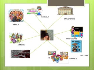 La persona enumera las personas y cosas importantes en su vida, incluyendo a su familia, escuela, universidad, amigos, profesores, lectura y alumnos.