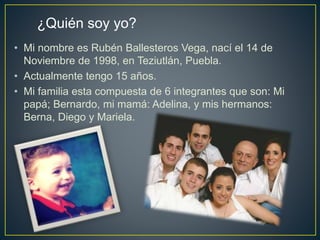 Este documento presenta una breve biografía de Rubén Ballesteros Vega. Describe eventos clave en su vida como su familia, educación primaria, viajes a Disneyworld y esquiar, su Primera Comunión, el fallecimiento de su abuela, graduación de la primaria, y su decisión de estudiar un año en Estados Unidos.
