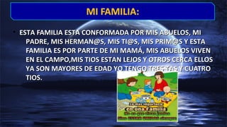 El documento presenta una autobiografía en la que se describe a la familia del autor, incluyendo a sus abuelos, padre, hermanos, tíos, primos y amigos cercanos. Se proporciona información sobre cada miembro de la familia como su edad, personalidad y actividades favoritas. También se mencionan amigos cercanos del autor de la escuela primaria y secundaria.