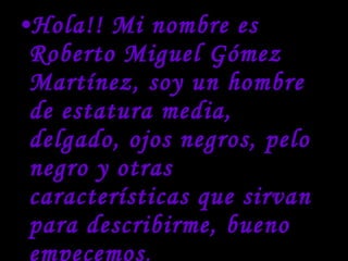 Este documento es la autobiografía de Roberto Miguel Gómez Martínez. Nació en Guadalajara y creció junto a sus padres y tres hermanos. Tuvo una infancia feliz con amigos cercanos y vacaciones divertidas. Estudió primaria y secundaria, donde disfrutó de la compañía de sus compañeros. Actualmente asiste a la preparatoria y valora las amistades que ha formado a lo largo de su vida.