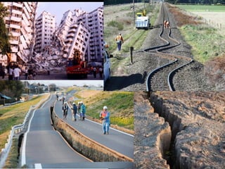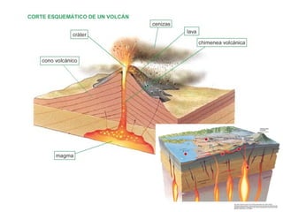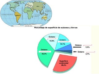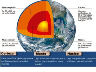 Este documento explica la estructura interna y externa de la Tierra, incluyendo el núcleo, manto y corteza. También describe los continentes, placas tectónicas, formación de montañas, volcanes, terremotos y otros aspectos del relieve terrestre. La teoría clave es que la deriva continental y la tectónica de placas son los principales impulsores del cambio en el relieve a lo largo del tiempo.