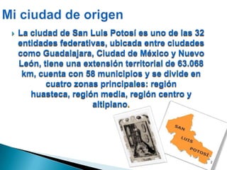 Este documento describe la ciudad de origen del autor, San Luis Potosí, México. Detalla que San Luis Potosí es una de las 32 entidades federativas de México ubicada entre otras ciudades importantes. También describe algunas de las atracciones y platillos típicos de la ciudad como iglesias, jardines, plazas, museos, cines y comidas como enchiladas potosinas y mole de olla. El autor también habla brevemente sobre su familia y algunas de las tradiciones y costumbres que celebran como el Día de la Independ