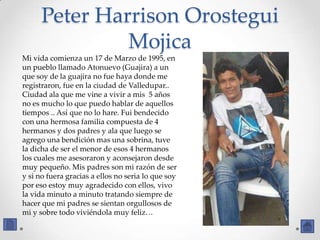 Peter Harrison Orostegui Mojica nació en 1995 en Atonuevo, Guajira y se mudó a Valledupar a los 5 años. Proviene de una familia de 4 hermanos y sus padres, Viterbo Orostegui y Yaneth Mojica, han sido su mayor apoyo. Estudió primaria en varias escuelas de Valledupar y secundaria en el colegio Alfonzo López Pumarejo, donde decidió estudiar Contaduría Pública en la UPC. Disfruta pasar tiempo con su sobrina Abigail.