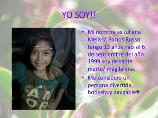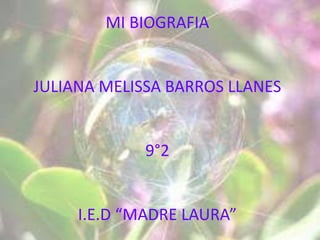 Este documento presenta una biografía de Juliana Melissa Barros Llanes, una estudiante de 13 años que vive en Santa Marta, Colombia. Ella describe a su familia, sus gustos que incluyen Facebook y la música, y sus metas de estudiar ingeniería de sistemas en el Sena para apoyar a su madre.
