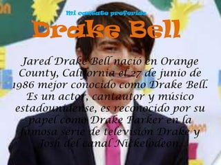 Drake Bell es un actor y músico estadounidense mejor conocido por su papel como Drake Parker en la serie de Nickelodeon "Drake y Josh". Comenzó a actuar a los 5 años y a tocar la guitarra y el piano desde los 12 años. Algunos de sus papeles más importantes han sido en "Drake y Josh", "The Jack Bull" y fue elegido por John Cusack para interpretar su papel joven en "High Fidelity". También se ha dedicado a la música y ha recibido nominaciones por su trabajo actoral.