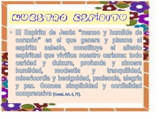 El documento describe la historia y misión de la Congregación de San Francisco de Sales. Fue fundada en 1740 por el sacerdote P. Doménico Leonati y toma su nombre del santo Francisco de Sales. La congregación se enfoca en la caridad esponsal con Dios, la dulce y humilde bondad, y servir a todos con caridad. Busca evangelizar a través de varias actividades educativas de acuerdo a la visión del fundador.