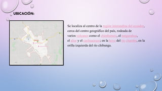 Riobamba se encuentra en el centro de Ecuador, rodeada de varios volcanes, en la orilla izquierda del río Chibunga. Conocida como la "Sultana de los Andes", Riobamba tiene una rica historia y cultura, y sus principales industrias son el comercio, la ganadería y la agricultura. El volcán Chimborazo, a solo 2 metros más bajo que el Everest, es una de las principales atracciones turísticas, junto con la deliciosa gastronomía local que incluye platos como el caldo de