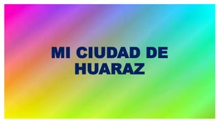 Este documento proporciona información sobre la ciudad de Huaraz, Perú. Huaraz es la capital del departamento de Áncash y fue fundada en 1574. El documento describe los principales lugares turísticos de Huaraz como la Laguna 69 y la Cueva de Guitarrero, así como la gastronomía local, fiestas patronales, flora, fauna, artesanía, clima, ubicación, música, danza y lengua nativa de la región.