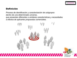 El documento habla sobre la segmentación de mercados. Explica que la segmentación consiste en identificar y caracterizar subgrupos dentro de un mercado que presentan necesidades similares para aplicarles propuestas comerciales específicas. Se pueden segmentar mercados basados en factores demográficos, psicográficos o de comportamiento. La segmentación permite a las empresas desarrollar estrategias de marketing más efectivas al enfocarse en nichos de mercado específicos.