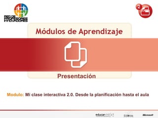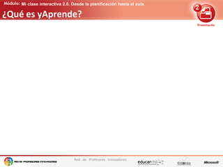 Este documento describe la plataforma educativa yAprende, la cual permite a los profesores crear clases interactivas utilizando recursos digitales. yAprende ofrece materiales educativos de editoriales líderes en varias materias. El módulo enseña a los profesores cómo planificar clases interactivas, buscar recursos en yAprende e insertarlos en presentaciones, y diseñar tareas para estudiantes.