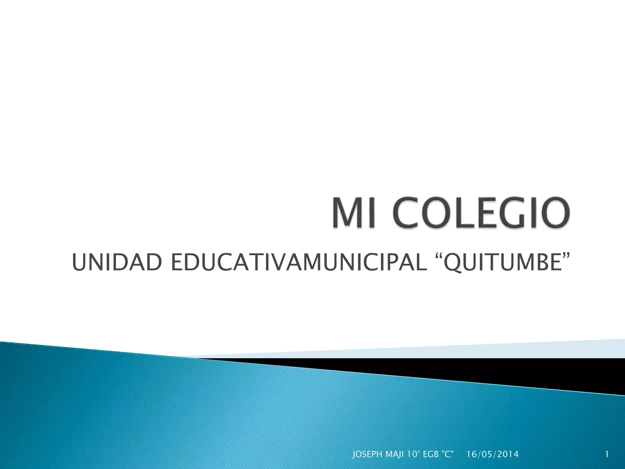 Este documento presenta información sobre la Unidad Educativa Municipal "Quitumbe". Describe su visión, misión e instalaciones como aulas, canchas recreativas y áreas verdes. También menciona a los profesores, personal, estudiantes y padres de familia que son parte de la institución. Detalla los idearios de la unidad educativa en torno a la formación de seres humanos con valores como el respeto, la tolerancia y la defensa de la naturaleza. Finalmente, resalta algunos logros como la recuperación del coliseo y la