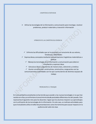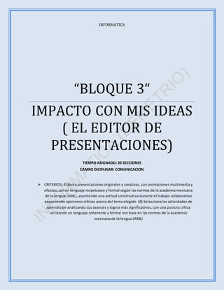 Este documento presenta un bloque de instrucciones para una tarea que involucra el uso del editor de presentaciones. Los estudiantes tienen 20 secciones para crear presentaciones originales y creativas que aborden un tema de manera respetuosa y formal según las normas lingüísticas, asumiendo una actitud constructiva colaborativa. La tarea busca que los estudiantes mejoren sus aprendizajes utilizando tecnologías de información como el editor de presentaciones.