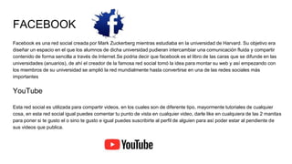 El documento presenta breves descripciones de cuatro redes sociales populares: Facebook, YouTube, Instagram y los posibles problemas con cada una. Facebook fue creada por Mark Zuckerberg para que los estudiantes de Harvard compartieran información. YouTube permite compartir y comentar videos. Instagram permite compartir fotos y mensajes. Si bien estas redes sociales permiten la comunicación, también pueden generar conflictos debido a comentarios ofensivos u otra información no deseada.