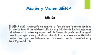 El documento describe las funciones y servicios del Servicio Nacional de Aprendizaje (SENA) de Colombia. El SENA ofrece formación profesional integral a trabajadores colombianos para contribuir al desarrollo social, económico y tecnológico del país. Sus servicios incluyen salud, deporte, cultura, bienestar y formación en habilidades blandas. El SENA también utiliza plataformas como Sofía Plus y Blackboard para facilitar la orientación y cursos de formación a distancia.