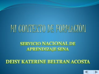 El documento describe la historia, misión, visión y símbolos del Servicio Nacional de Aprendizaje (SENA) de Colombia. Explica que el SENA fue creado en 1957 para brindar formación profesional y técnica. Su misión es ofrecer formación que contribuya al desarrollo del país, mientras que su visión es convertirse en una entidad líder mundial en formación profesional para el 2020. También describe los roles del aprendiz y tutor SENA y los sistemas de administración de aprendizaje que utiliza, como la pl