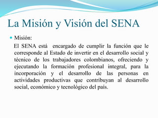 El documento describe la misión y visión del SENA de Colombia. Su misión es ofrecer formación profesional para facilitar el desarrollo social, económico y tecnológico del país. Su visión para 2020 es ser una institución de clase mundial que contribuya a la competitividad de Colombia a través de la formación profesional y el uso de tecnología e innovación. También describe los roles del aprendiz y tutor en la modalidad virtual de aprendizaje.