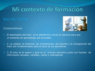 Este documento describe los roles del aprendiz y el tutor en el aprendizaje. Define al aprendiz como el protagonista de su aprendizaje que desarrolla habilidades y responsabilidades planificando sus actividades diarias. Define al tutor como el asesor y guía del aprendiz que debe proveer orientaciones claras y motivadoras usando fuentes de información actualizadas. También destaca que el tutor debe tener habilidades comunicativas y de manejo de herramientas tecnológicas para apoyar el aprendizaje en línea.