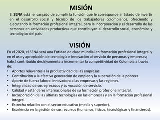 El documento presenta información sobre el contexto de formación de Francy Elena Figueroa en el SENA. Describe la misión y visión del SENA, la cual incluye ofrecer formación profesional integral para contribuir al desarrollo social, económico y tecnológico de Colombia. También presenta detalles sobre el escudo, la bandera, el logotipo y el himno del SENA.