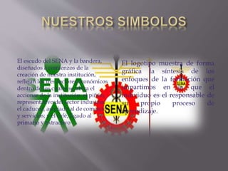 El documento describe los objetivos del SENA para el 2020, incluyendo convertirse en una entidad líder en formación profesional e innovación tecnológica para apoyar el desarrollo empresarial y social en Colombia. El SENA busca contribuir a la productividad de las empresas, generación de empleo, reducción de pobreza, y desarrollo regional a través de egresados calificados y el uso de tecnología de punta.