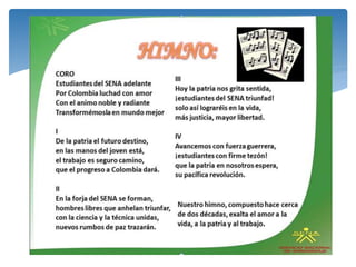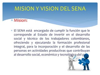 El documento describe la misión y visión del SENA de ofrecer formación profesional integral para contribuir al desarrollo de Colombia. Explica que el escudo y la bandera del SENA representan los sectores económicos de industria, comercio y sector primario. También define los roles del aprendiz y tutor virtual, y describe algunos programas de bienestar para los aprendices como apoyo sostenimiento, monitorías y un sistema de información de gestión. Finalmente, resume las funciones de las plataformas Blackboard y Sofia Plus utilizadas para la enseñ