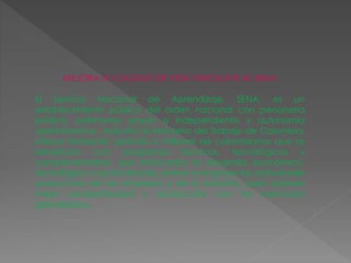 El documento describe el Servicio Nacional de Aprendizaje (SENA) de Colombia. El SENA ofrece formación gratuita a millones de colombianos en programas técnicos, tecnológicos y complementarios para contribuir al desarrollo económico, tecnológico y social del país. El SENA también busca mejorar la calidad de vida de los colombianos a través de la educación y capacitación laboral. El software SOFIA Plus permite a los estudiantes del SENA acceder a recursos de aprendizaje en línea y gest