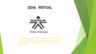 El documento describe el papel del Servicio Nacional de Aprendizaje (SENA) en Colombia. El SENA se encarga de ofrecer formación profesional a los trabajadores colombianos para contribuir al desarrollo económico, social y tecnológico del país. También explica que en la modalidad de formación virtual o a distancia, los aprendices deben desarrollar habilidades para ser responsables de su propio aprendizaje, mientras que los tutores deben orientarlos y tener habilidades comunicativas y tecnológicas para
