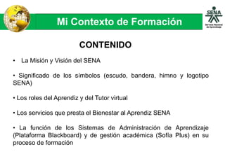 Este documento describe el contexto de formación del SENA. Explica la misión y visión de SENA, los roles del aprendiz y tutor virtual, los servicios de bienestar al aprendiz, y los sistemas de administración de aprendizaje y gestión académica (Blackboard y Sofía Plus). El objetivo es brindar información a los aprendices sobre el marco institucional de su formación en SENA.