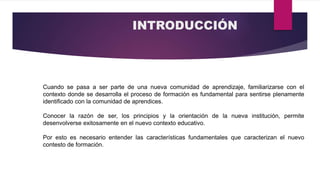 El documento describe el contexto de formación en el SENA, incluyendo su misión de ofrecer formación profesional para el desarrollo de Colombia, la visión de ser una institución de clase mundial, y los símbolos que representan los sectores económicos. También explica los roles del aprendiz y tutor virtual en el aprendizaje, los servicios de bienestar para aprendices, y los sistemas Blackboard y Sofía Plus para la administración de cursos y la gestión académica.