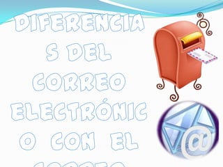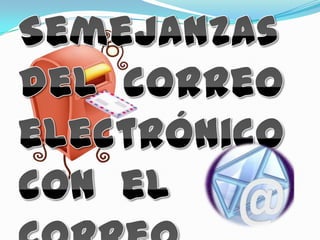 Este documento compara el correo electrónico y el correo postal, destacando que el correo electrónico permite enviar información a miles de personas rápidamente y de forma gratuita, mientras que el correo postal solo puede enviarse a un destinatario a la vez y requiere de varios pasos y el pago de tarifas para su envío. Ambos métodos cumplen la función de mantener informados a otros sobre lo que sucede en la distancia y permiten la comunicación escrita entre personas.