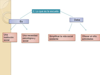 Este documento discute los principios fundamentales de la educación. Argumenta que la educación verdadera estimula las capacidades del niño a través de la participación en la sociedad, y que la escuela debe simplificar la vida social existente y ofrecer actividades para el desarrollo del niño. También sostiene que los métodos de enseñanza deben involucrar imágenes y emociones para conectar con las experiencias de los estudiantes, y que la educación y los maestros deben tomar en cuenta los ideales individuales y sociales para formar una vida social