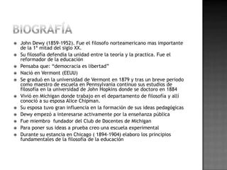 John Dewey fue un filósofo estadounidense que defendió una educación basada en la experiencia y la actividad del estudiante. Creía que los niños llegan a la escuela con capacidades innatas y que la educación debe estimularlas mediante situaciones sociales. Fundó escuelas experimentales para poner en práctica sus ideas sobre una enseñanza centrada en la vida comunitaria y las necesidades del estudiante.
