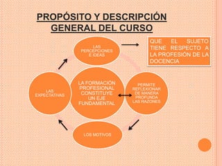 Este curso titulado "El sujeto y su formación profesional como docente" tiene como objetivo que los futuros maestros reflexionen sobre todos los aspectos relacionados con la profesión docente y reconozcan los niveles de compromiso que adquirirán al elegir esta profesión. El curso se divide en tres unidades que abordan temas como la identidad del docente, los retos de la profesión y las diferentes visiones sobre la formación docente con el fin de analizar a profundidad esta vocación.
