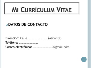 El documento presenta el currículum vitae de Alba Mateos Ibáñez. Actualmente cursa la licenciatura en Publicidad y Relaciones Públicas en la Universidad de Alicante y el grado en Administración y Dirección de Empresas en la UNED. Ha realizado varios cursos de formación extra académica y domina varios idiomas e informática.