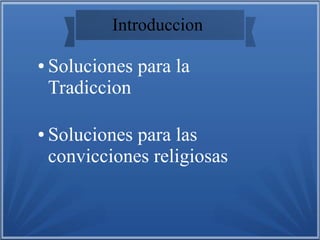 El documento presenta posibles soluciones a los problemas de la cultura. Propone programas para rescatar las tradiciones y costumbres culturales. También sugiere que la cultura es fundamental para la identidad de los pueblos y debe usarse para formar personas con valores éticos y estéticos. Finalmente, critica el fanatismo religioso y los actos extremos que realizan algunos seguidores en nombre de su fe.