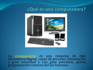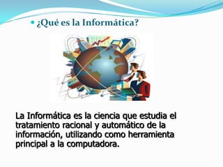 El documento describe los componentes principales de una computadora, incluyendo la unidad central de procesamiento (CPU), la memoria central, el sistema operativo, los periféricos de entrada y salida como teclado, monitor y dispositivos de almacenamiento como discos duros. Explica que la informática es la ciencia que estudia el procesamiento automático de información usando computadoras.