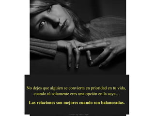Este documento ofrece varios consejos sobre las relaciones interpersonales y la vida en general. Recomienda no justificarse ante quien no te valora, mantener un equilibrio en las relaciones, perseguir tus sueños en lugar de quedarte dormido, y pensar dos veces antes de tomar decisiones cuando estás emocionado o triste. También aconseja apreciar cada momento en lugar de quejarte de lo ocupado que estás y disfrutar el presente porque el tiempo pasa rápido.