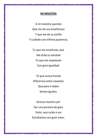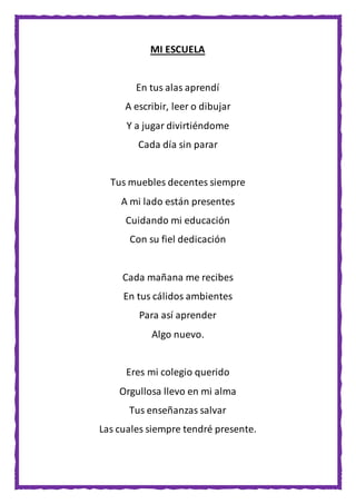 Este documento contiene tres poemas que describen la escuela, la maestra y verdades amargas sobre la vida. El primer poema expresa gratitud hacia la escuela por enseñar y cuidar a los estudiantes. El segundo elogia a la maestra por enseñar con cariño e igualdad. El tercer poema presenta una visión pesimista del mundo, donde la amistad y el valor de las personas dependen de su riqueza y estatus social.