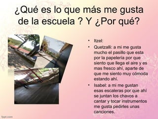 Tres estudiantes - Itzel, Quetzalli e Isabel - discuten lo que más y menos les gusta de su escuela, las materias favoritas y las carreras que planean estudiar. A Quetzalli le gusta el pasillo cerca de la papelería por el aire fresco. A Isabel le gustan las escaleras donde los estudiantes cantan. Ninguna les gusta mucho el salón o la cafetería debido al ruido y multitudes. A todas les gusta matemáticas y a Isabel también le gusta la lectura. Itzel aún no elige una carrera, mientras