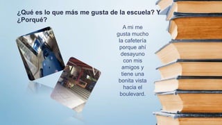 Gabriel disfruta de la cafetería de la escuela porque puede desayunar con amigos y tiene una buena vista. No le gustan el salón de clase ni los jardines porque están sucios y descuidados. Aprende mucho en informática y ciencias sociales. Continúa estudiando en la escuela porque encontró amigos y queda cerca de su casa. Planea estudiar ingeniería porque le interesan los autos.