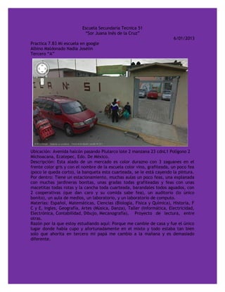 La escuela secundaria técnica 51 "Sor Juana Inés de la Cruz" se encuentra en Avenida halcón pasando Plutarco lote 2 manzana 23 cdnL1 Polígono 2 Michoacana, Ecatepec, Edo. De México. La escuela tiene un estacionamiento, muchas aulas, una explanada con jardineras, gradas grafiteadas, una cancha cuarteada, dos cooperativas y un auditorio. Ofrece materias como Español, Matemáticas, Ciencias, Historia, Inglés, Geografía, Artes