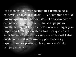 Un joven recibe una llamada de su ex novia para reunirse en el parque. Al llegar, ella luce pálida y le entrega una cruz, diciendo que lo ama. La acompaña a su casa y sus amigos le dicen que falleció. La madre le explica que murió de tristeza. En una carta, ella dice que también sentía lo mismo y se despide de él. El joven se da cuenta que dejaron que el rencor los separara y pide perdón.