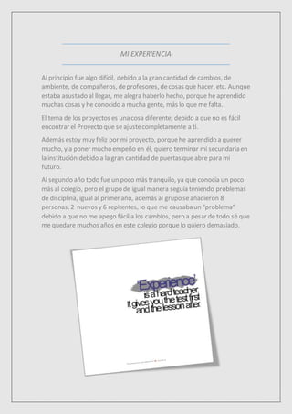 El documento describe la experiencia del autor en un nuevo colegio, incluyendo los desafíos iniciales de adaptarse a tantos cambios y personas nuevas. Aunque al principio estaba asustado, el autor se alegra de haberse cambiado de colegio porque ha aprendido mucho y ha conocido a mucha gente. El autor también expresa su felicidad por su proyecto escolar, el cual ha aprendido a valorar, y su deseo de terminar la secundaria en esta institución debido a las oportunidades que le brinda para el futuro.