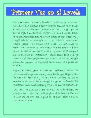La autora describe su experiencia inicialmente nerviosa al cambiar de colegio e ingresar al Loyola, pero cómo con el tiempo llegó a querer mucho la institución. A pesar de faltar a clases antes de los exámenes de admisión, logró ingresar y se sintió feliz al ver su nombre en la lista de admitidos. Una vez en el colegio, conoció nuevas personas que la ayudaron y se adaptó bien a su salón de clases, aunque cambió varias veces de grupo de proyecto debido a problemas con la comunicación y las