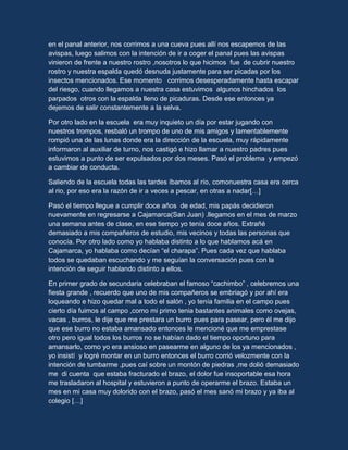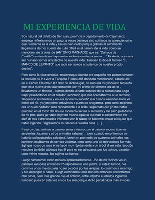 El documento describe las experiencias de vida del autor desde su niñez en Tarapoto hasta su ingreso a la universidad en Cajamarca. Relata varios incidentes de riesgo que enfrentó de niño como casi ahogarse en un río, ser atacado por cerdos salvajes y avispas, y fracturarse el brazo montando un burro indomable. También habla sobre trabajar en obras de construcción para juntar dinero y postular nuevamente a la universidad, donde finalmente logró ingresar y cumplir el sueño de sus padres.