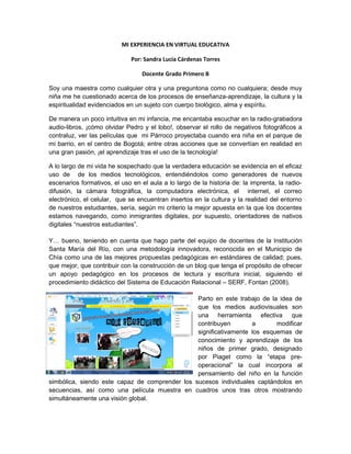 La presentación describe la experiencia de Sandra Lucía Cárdenas como maestra de primer grado en la Institución Santa María del Río en Chía, Colombia. Explica cómo creó un blog para apoyar los procesos de lectura y escritura de sus estudiantes utilizando medios audiovisuales. Presentó su experiencia en el XIV Encuentro Internacional de Educación en Medellín sobre cómo los medios tecnológicos pueden mejorar el aprendizaje de los niños pequeños. Agradece el apoyo recibido de la comunidad educativa, pad