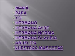 Este documento presenta información biográfica sobre la familia del autor. Describe a su mamá María E. Gaitán Pardo, su papá José Cañón León, sus hermanas María Aidé, Norma y Claudia González Pardo, su fallecida abuela Ana Gaitán, y las mascotas de la familia - los perros Tonki y Mateo y la gata Akira.