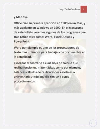 Este documento describe los programas de Office como Word, Excel y PowerPoint. Word es un procesador de texto utilizado para documentos. Excel es una hoja de cálculo que realiza funciones matemáticas. PowerPoint permite crear presentaciones con diapositivas y animaciones. También explica cómo incluir marcas de agua y combinar correspondencia en Word.